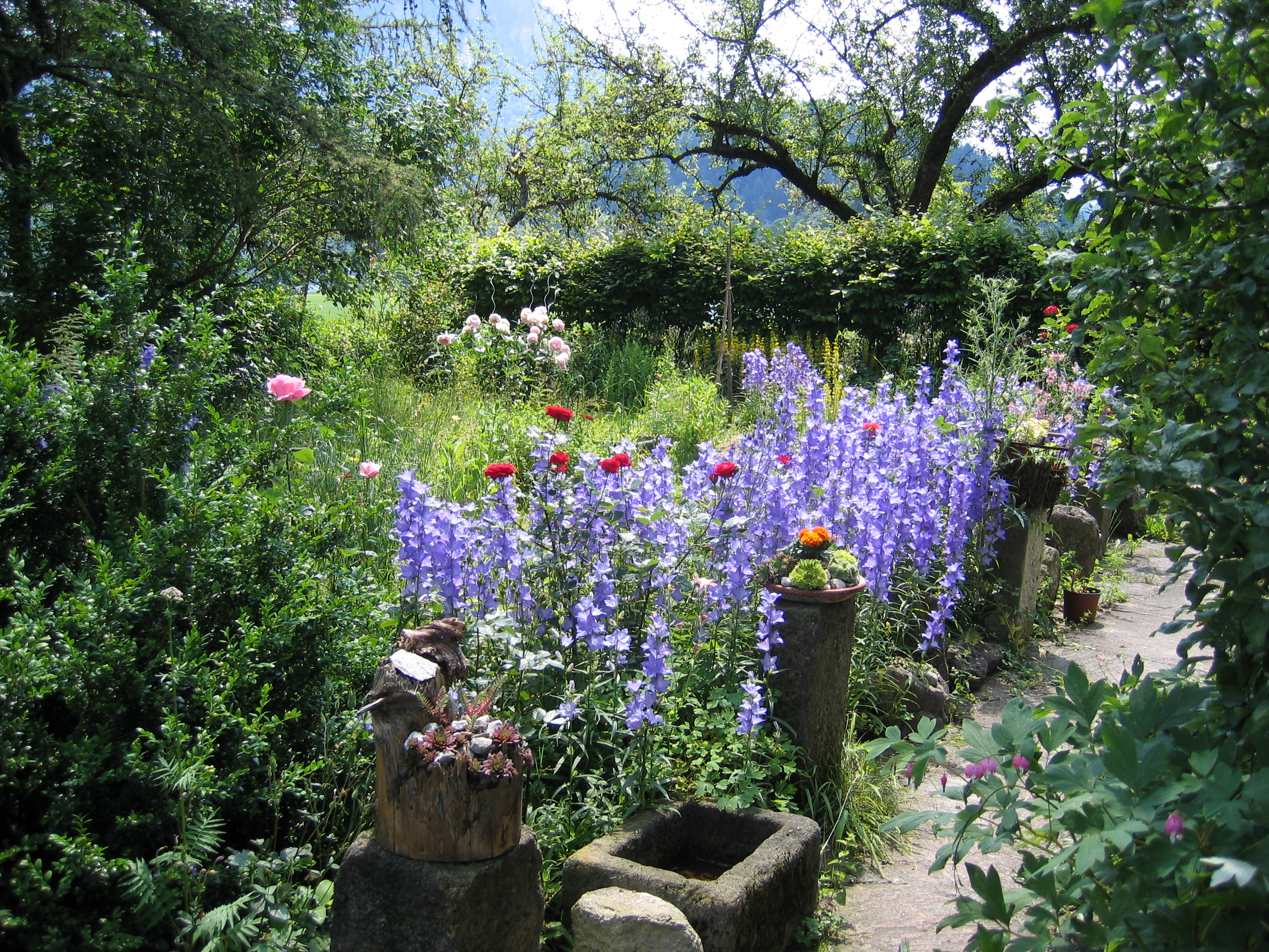 Der Garten der Leitnervilla dient mit Milpabeeten der Versorgung. Die Milpabeete sind eingebettet wie bei der Permakultur in einheimische Wiesenvegetation.